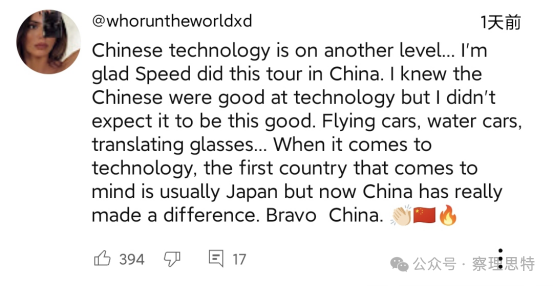 (中國的科技水平又上了一個(gè)臺(tái)階......我很高興Speed在中國舉辦了這次巡演。我知道中國人擅長(zhǎng)科技,但我沒想到會(huì)這么好。飛行汽車、水上汽車、翻譯眼鏡......說到科技,首先想到的國家通常是日本,但現(xiàn)在中國真的做出了改變。中國萬歲!)