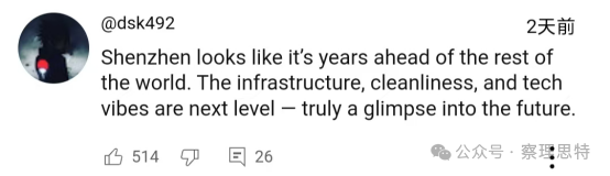 (“深圳看起來比世界其他地方領(lǐng)先好幾年?;A(chǔ)設(shè)施、清潔度和科技氛圍都是一個(gè)新的水平——真正讓人看到了未來?!保?/p>