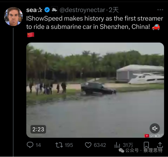 (IShowSpeed 創(chuàng)造了歷史,成為第一個(gè)在中國深圳乘坐潛水艇車的流量博主!)
