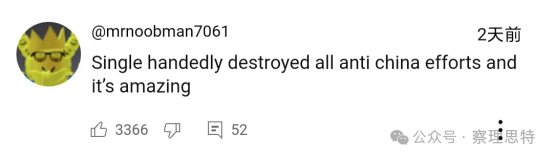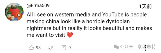 在YouTube上,“單槍匹馬摧毀了所有的反華努力,這太神奇了”“中國被低估了,簡(jiǎn)直難以置信”“這次旅行是中國有史以來最好的宣傳”“在我看來深圳是中國最好的城市。有邁阿密的天氣、空氣和景觀,有紐約的摩天大樓,有上海的國際氛圍,有重慶的科技和賽博朋克美學(xué),還帶點(diǎn)廣東味”這樣的感嘆不勝枚舉。