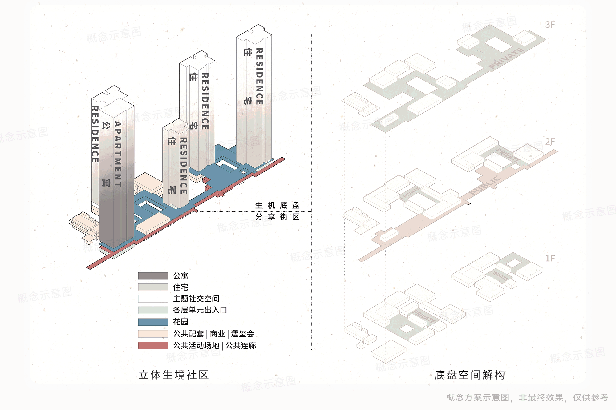 創(chuàng)新打造“生機底盤”,構(gòu)筑都市綠洲,回歸內(nèi)心寧靜。首層庭院圍合出靜謐綠洲,闊綽車馬院與酒店式落客區(qū)以從容禮序迎接歸家;二層環(huán)廊將通過約2公里慢行長廊(規(guī)劃中)銜接城市藝術(shù)與商業(yè);三層天際花園融匯浮島、水景與萌寵樂園,營造出全齡共聚的度假式社交場域。