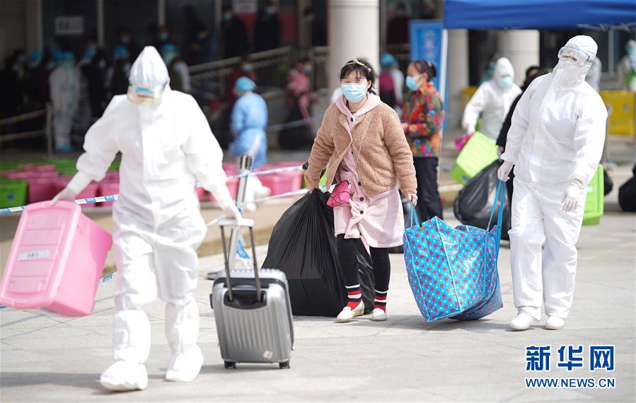 3月10日,在武漢江夏方艙醫(yī)院,醫(yī)護人員幫助新冠肺炎治愈患者(中)拿行李。新華社記者才揚攝