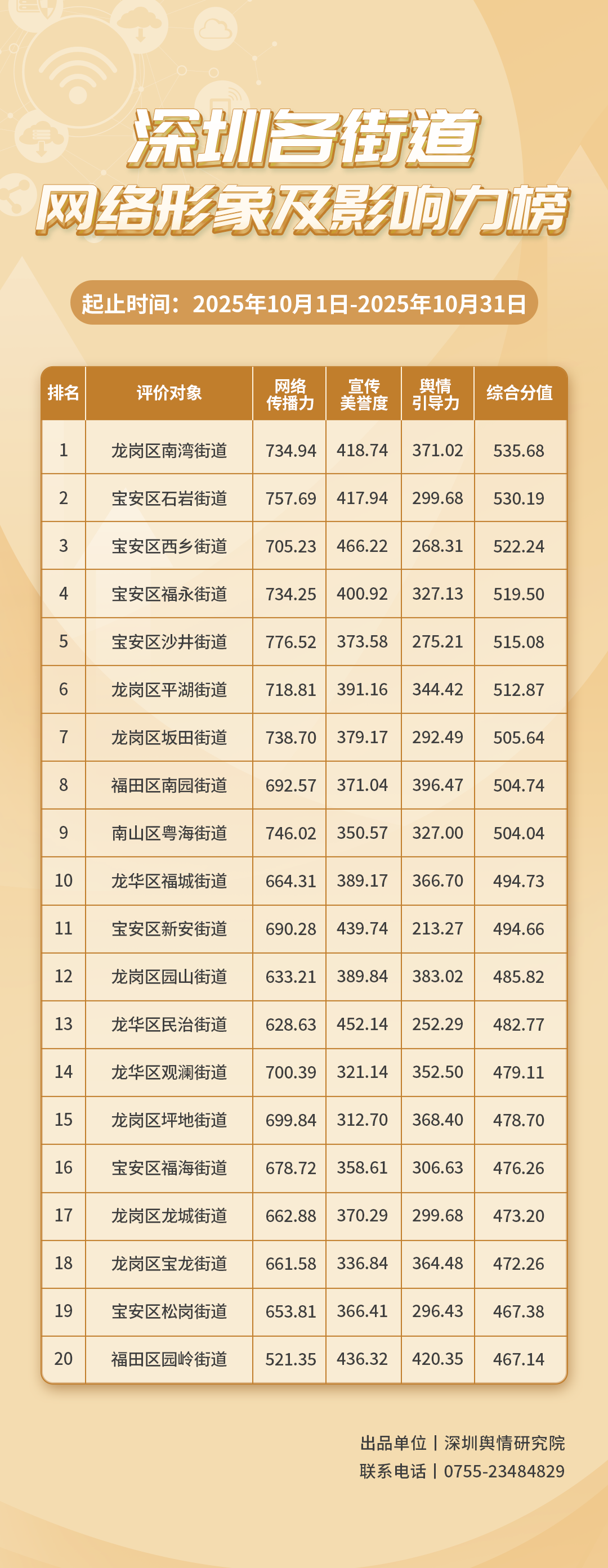 為深入了解深圳市各街道的網(wǎng)絡(luò)形象構(gòu)建狀況和社會影響,推動街道治理“提質(zhì)增效”,增強城市高質(zhì)量發(fā)展動能,深圳輿情研究院編制推出《深圳各街道網(wǎng)絡(luò)形象及影響力榜》。榜單具有獨立客觀的評價體系,通過數(shù)據(jù)采集和分析,評估各街道的網(wǎng)絡(luò)傳播力、宣傳美譽度及輿情引導(dǎo)力,并對全市11個區(qū)共78個街道的網(wǎng)絡(luò)形象及影響力進(jìn)行綜合排名。