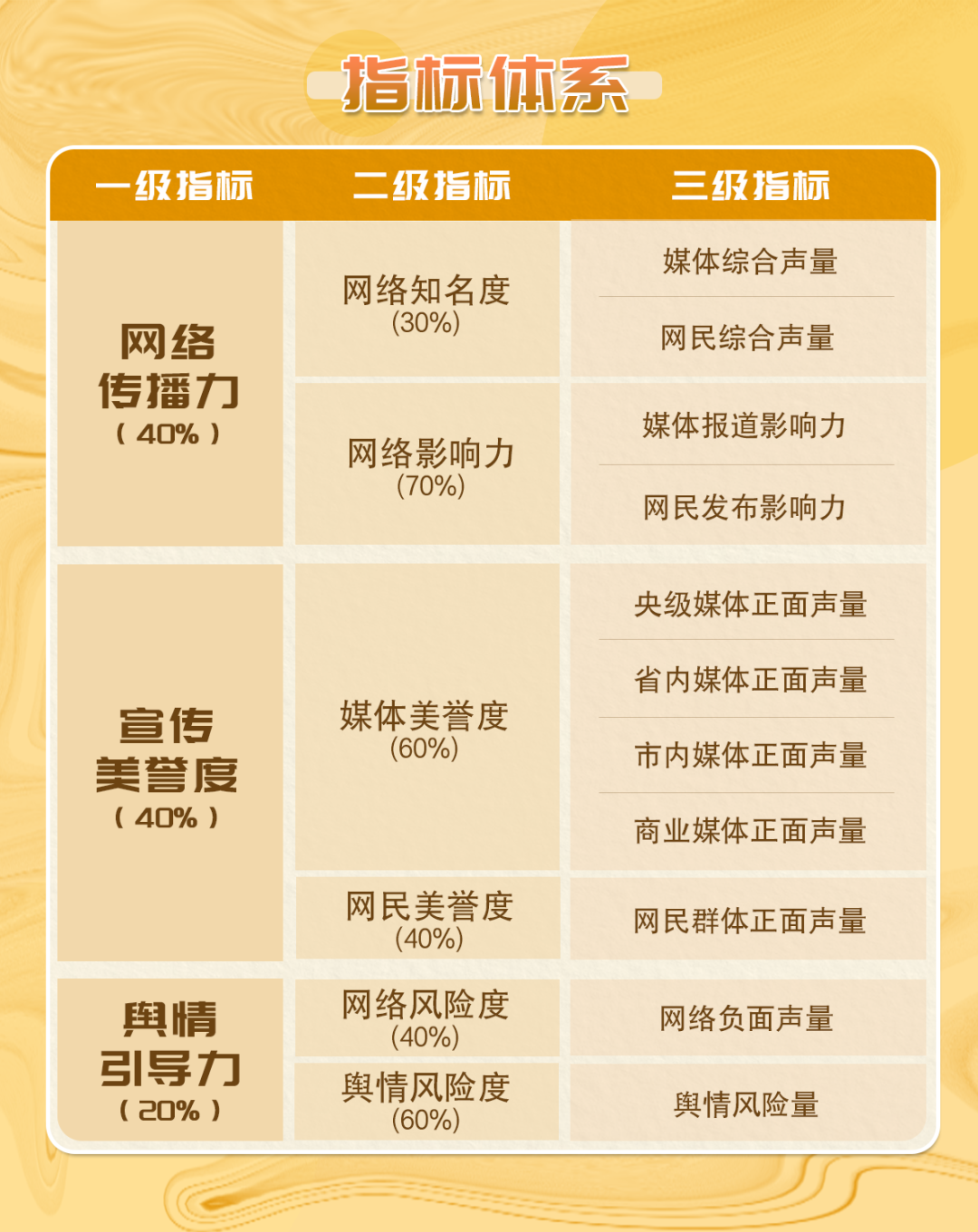 《深圳各街道網(wǎng)絡(luò)形象及影響力榜》具有科學(xué)、可信、量化的指標(biāo)評價體系,能夠全面客觀地評估各街道的網(wǎng)絡(luò)綜合形象及影響力值。具體指標(biāo)體系如下圖所示↓